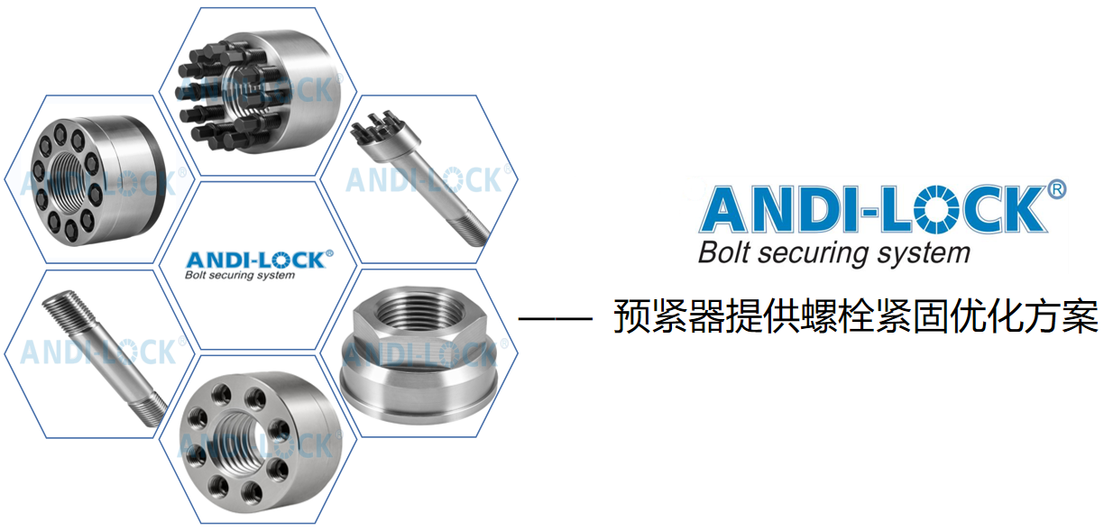 ANDI-LOCK®預緊器被設計來直接取代傳統的螺母和螺栓。這些裝置可以旋合于一個新的或者現有的螺栓,螺柱,螺桿或者軸上。主螺紋用于安置預緊器在螺栓或者螺柱上并靠在硬化墊圈及承載面上,一旦安置到位,螺栓或者螺柱的實際的預緊通過簡單的手動工具來擰緊環繞主螺紋一圈的頂推螺釘來實現。頂推螺釘均勻地傳遞預緊力到主螺紋上,從而也傳遞到連接件上。主螺紋被純張力鎖緊。