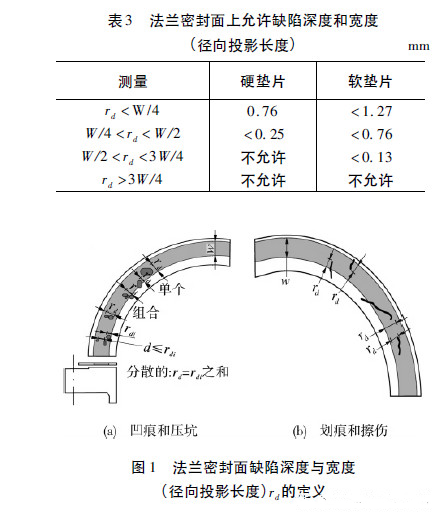 同理,軟墊片和硬墊片對法蘭密封面上的局部缺陷( 點、坑、溝槽、凹痕、劃傷、腐蝕等) 的允許范圍也不同。表3 列出了法蘭密封面上允許的局部缺陷的深度和寬度( 徑向投影長度) 的要求( 表中符號的定義見圖1) 。