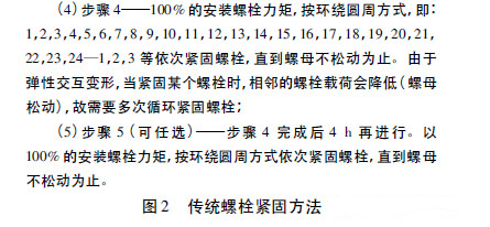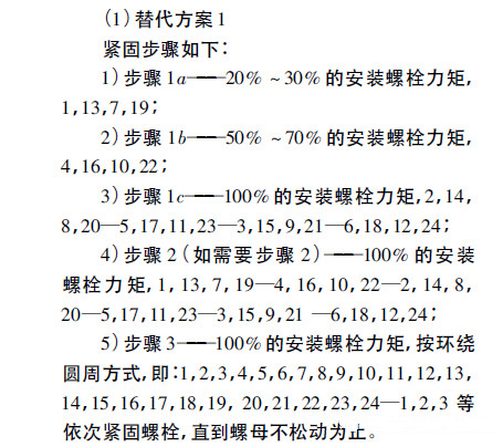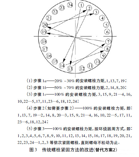 ????替代方案2 的緊固步驟類似方案1,只是緊固方式不同于傳統星形方式,而是按螺栓順序號以交叉方式( 見圖3) ,這樣不需要裝配者在法蘭上對螺栓進行編號。
